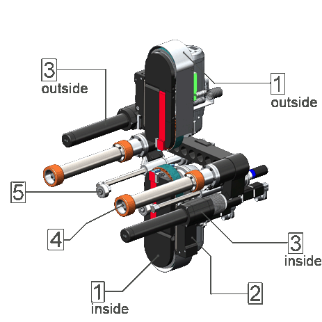 | Grinding Equipment The drawing shows complete grinding head but without cables and handling devices. In the simulation (see Clips) we point out a technical innovation: The parallel position of the grinding belt toward the pipe surface at all time. 1 Belt grinder outside / inside Working of weld height inside and outside of pipe ends 2 Radial axis Vertical movement of grinding unit 3 Axial axis Movement of grinding equipment parallel to pipe axis 4 Rotational axis Movement of grinding equipment circumferential to pipe 5 Clamping unit Fixing of grinding equipment to pipe |